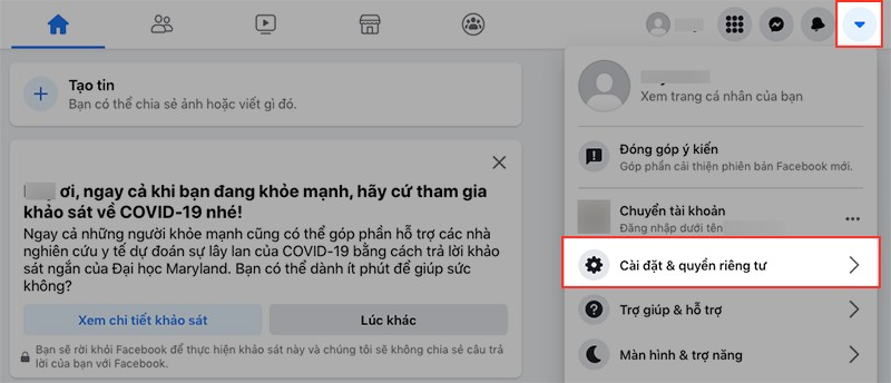Bước 1: Đầu tiên, trên giao diện chính của Facebook, bạn ấn chọn biểu tượng mũi tên -> Bấm vào Cài đặt và quyền riêng tư.