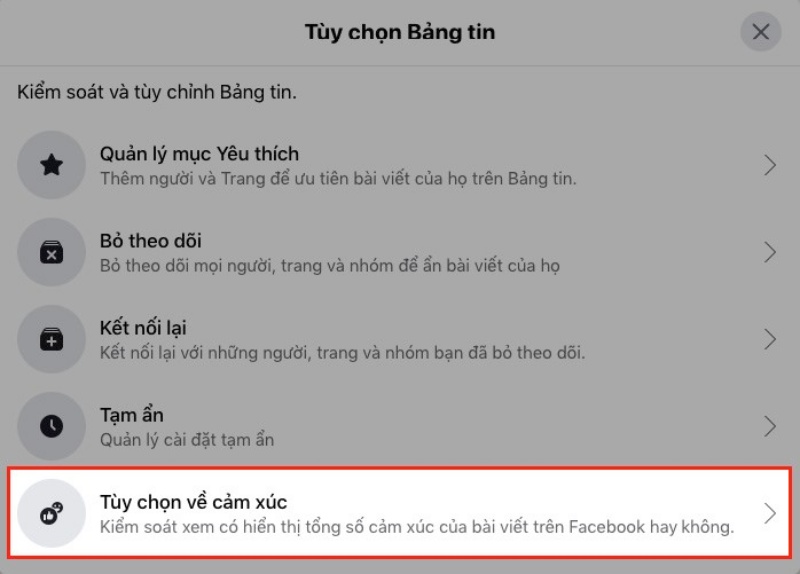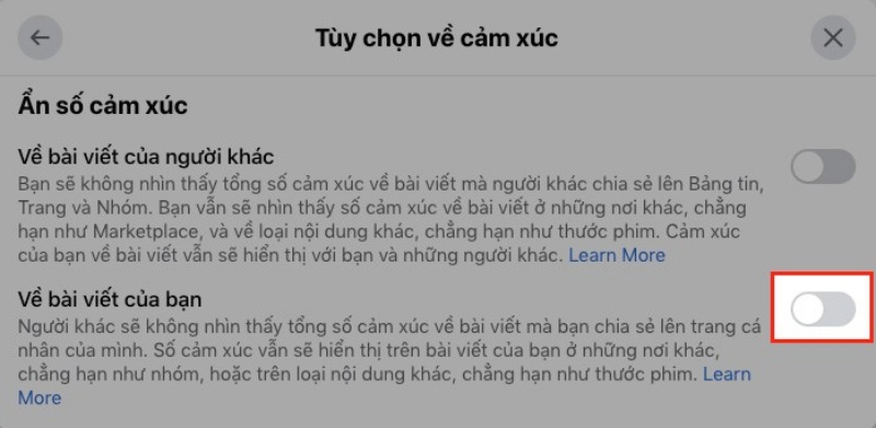 Bước 3: Sau đó, bạn lướt xuống chọn mục Tuỳ chọn về cảm xúc -> Tiến hành Gạt thanh trượt sang phải -> Tiếp theo, tại mục Về bài viết của bạn để ẩn số lượt like bài đăng Facebook -> Nếu bạn không muốn xem số like bài viết người khác thì hãy chọn phần Về bài viết của người khác.
