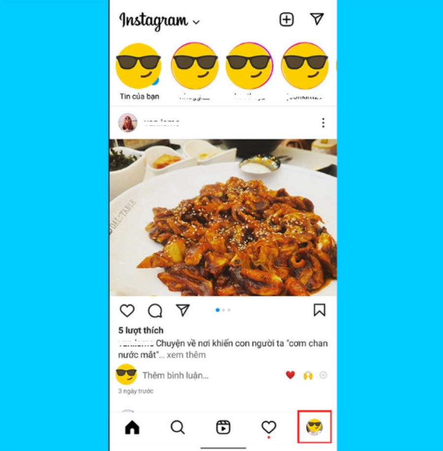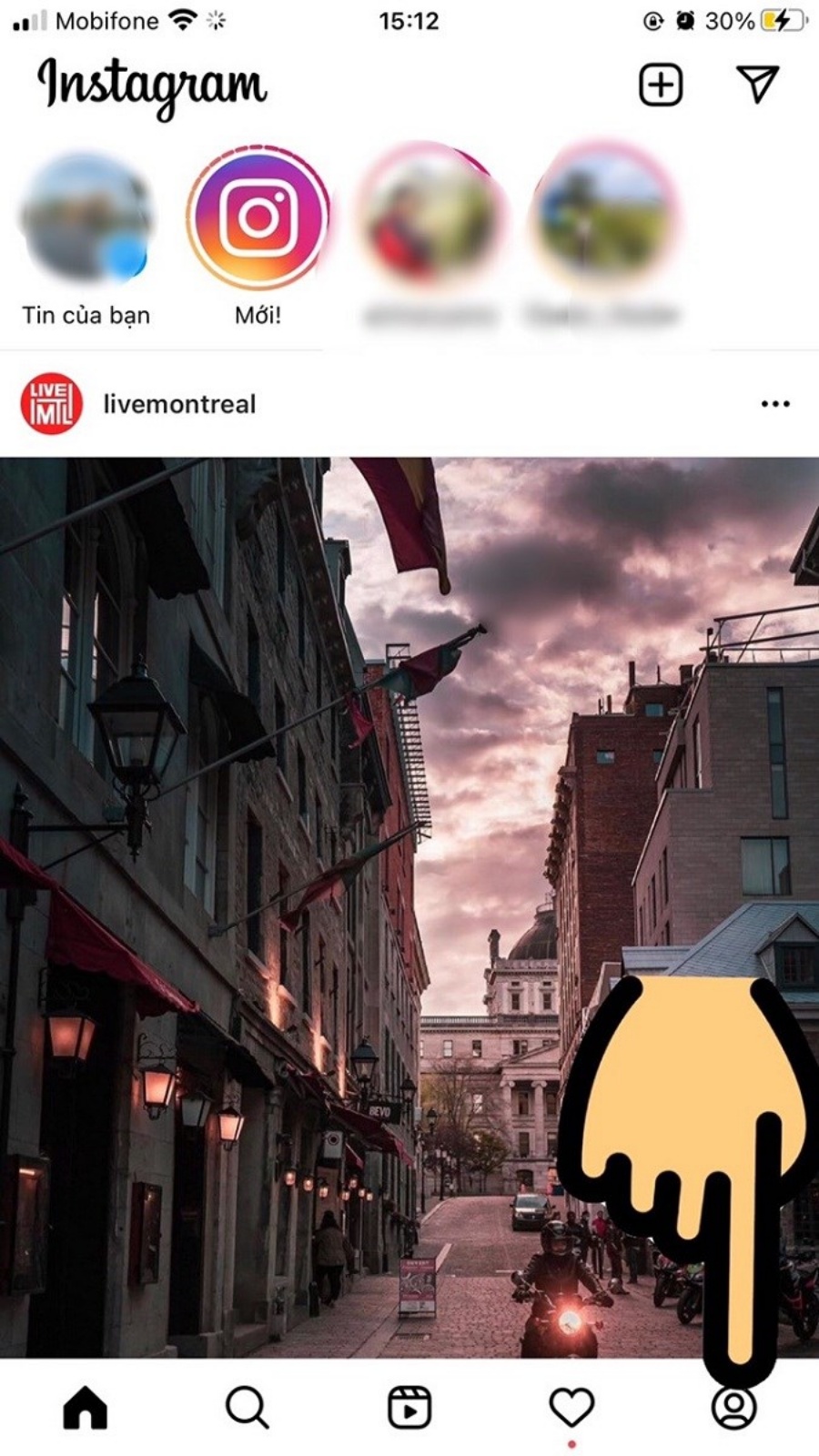 Bước 1: Đầu tiên, tại giao diện chính Instagram -> Bấm vào biểu tượng Hồ sơ cá nhân.