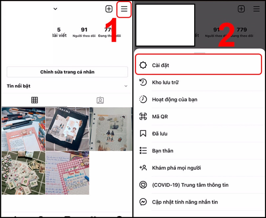 Bước 2: Kế đến, ấn chọn vào 3 gạch (phía trên bên phải màn hình) -> Nhấn chọn Cài đặt.