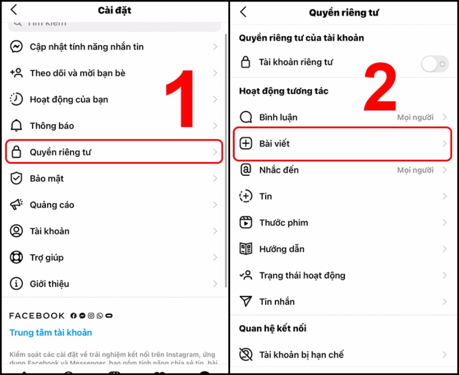 Bước 3: Sau đó, nhấn chọn mục Quyền riêng tư -> Bài viết.