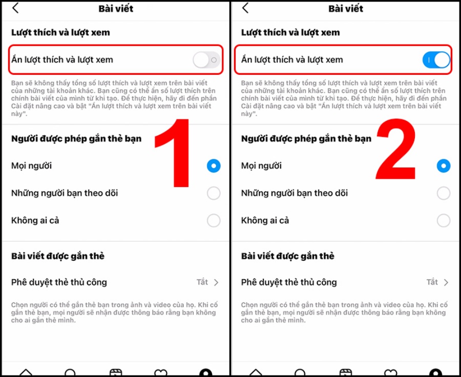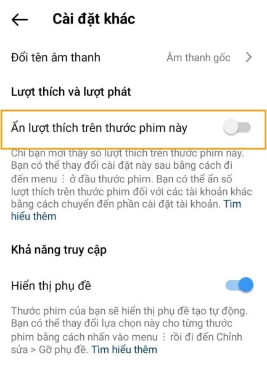 Bước 5: Cuối cùng, tại mục “Ẩn số lượt thích và lượt xem” -> Bạn kéo công tắc sang phải để bật lên là hoàn tất.
