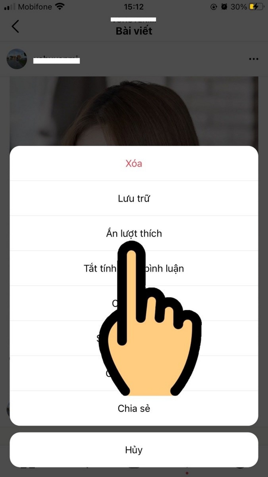 Bước 3: Kế đến, lần lượt chọn Quản lý (Manage) => Tiến hành Ẩn lượt thích (Hide like) là được. Đồng thơi, bạn cũng có thể chọn Tắt tính năng bình luận nếu muốn.