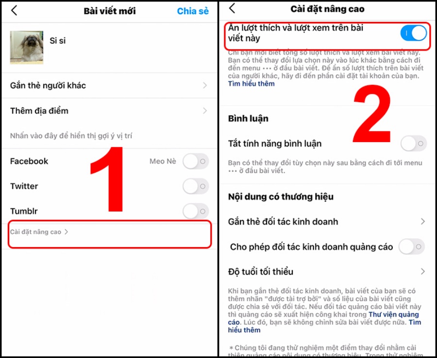 Đầu tiên, nhấn vào Cài đặt nâng cao ở dưới -> Tiến hành bật Ẩn lượt thích và lượt xem trên bài viết này là hoàn tất.