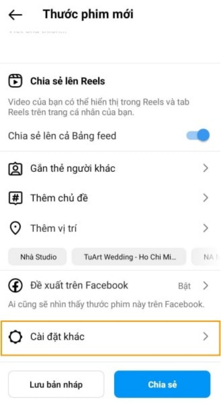 Bước 2: Sau đó, tại giao diện đăng Thước phim (bước cuối cùng trước khi đăng Reel), bạn ấn chọn Cài đặt nâng cao (Advanced Settings) hoặc Cài đặt khác, tùy phiên bản.