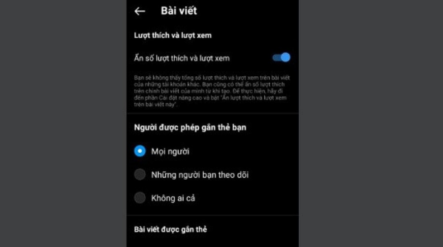 Bước 4: Cuối cùng, tại giao diện của mục Bài viết -> Tiến hành gạt thanh trượt của mục Ẩn số lượt thích và lượt xem để có thể ẩn số lượt like trên bài đăng là xong.