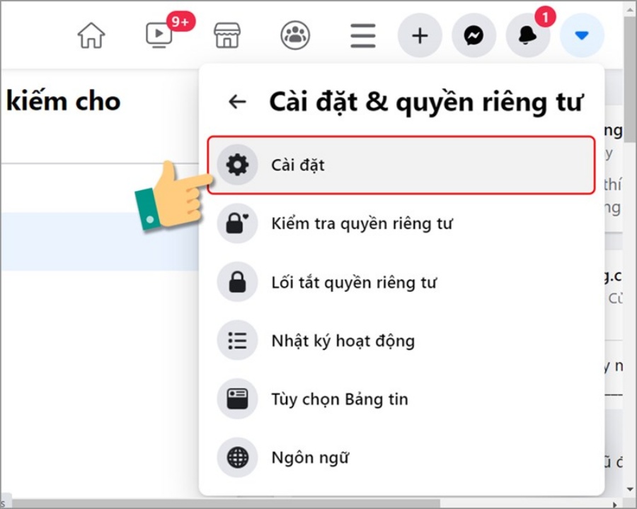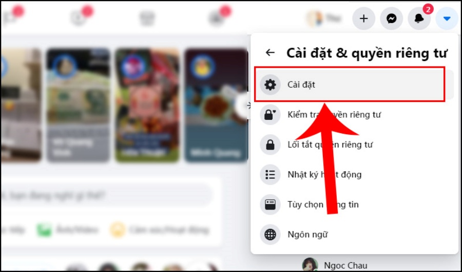 Bước 1: Đầu tiên, bạn truy cập trang Facebook trên máy tính -> Tại giao diện Facebook, bấm chọn biểu tượng mũi tên -> Ấn vào Cài đặt & và quyền riêng tư -> Chọn Cài đặt.