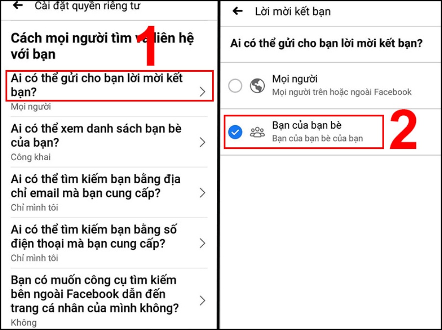 Sau đó, bạn ấn chọn vào Ai có thể gửi cho bạn lời mời kết bạn -> Bấm chọn Bạn của bạn bè.