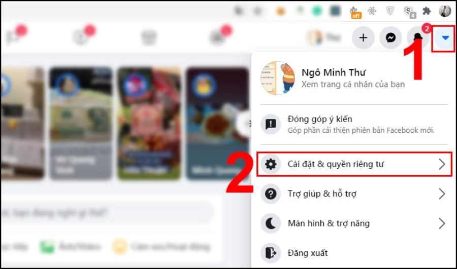 Bước 1: Đầu tiên, tại giao diện chính của Facebook -> Nhấn chọn biểu tượng mũi tên -> Bấm vào Cài đặt và quyền riêng tư.