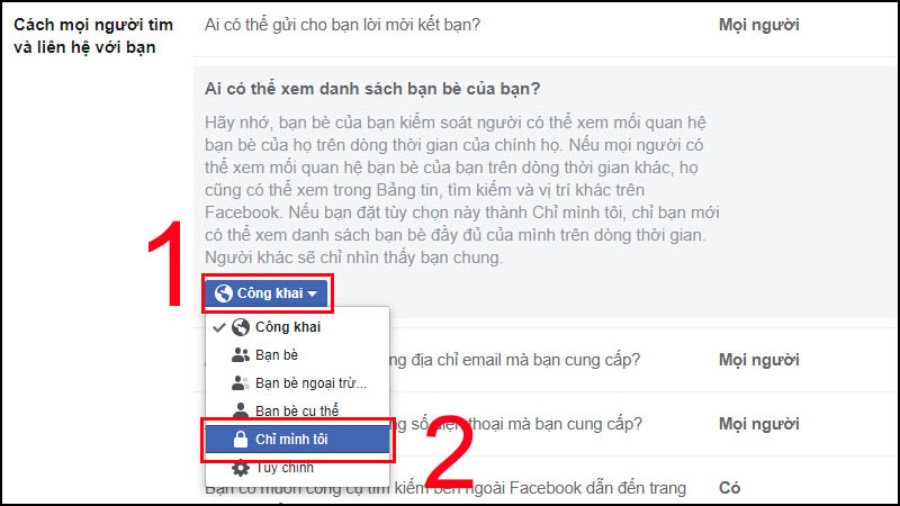 Tiếp theo, ấn chọn các mục Ai có thể xem danh sách bạn bè của bạn?, Ai có thể tìm kiếm bạn bằng địa chỉ email mà bạn cung cấp?, Ai có thể tìm kiếm bạn bằng số điện thoại mà bạn cung cấp? -> Tiến hành chỉnh về Chỉ mình tôi.