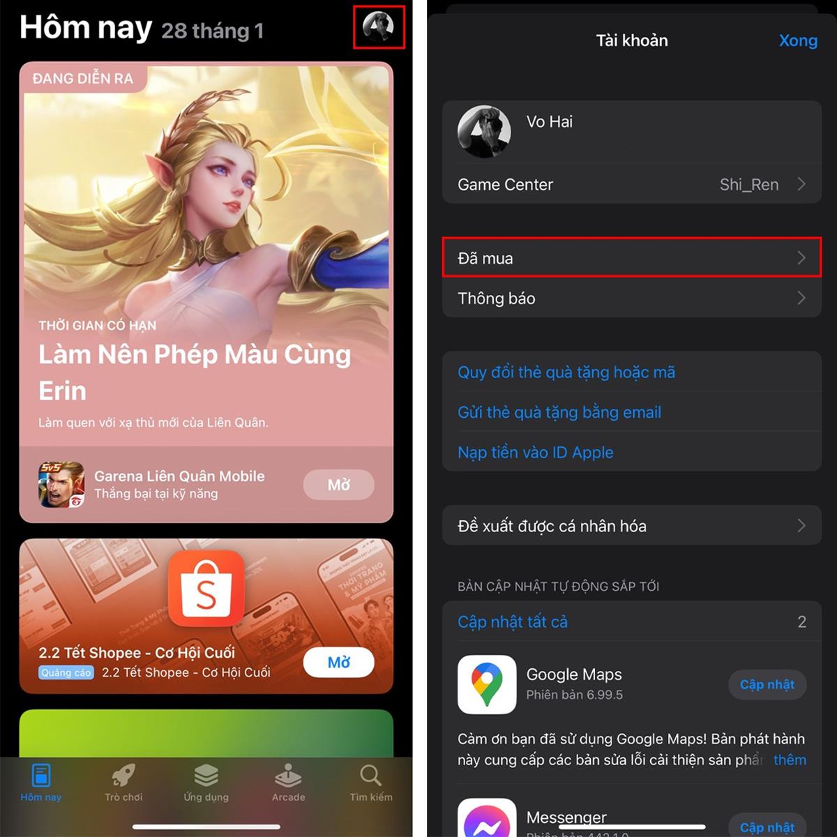 Bước 1: Đầu tiên, hãy vào App Store > Sau đó chọn vào biểu tượng avatar ở phía trên góc phải màn hình > Nhấn vào Đã mua dùm mình nhé.