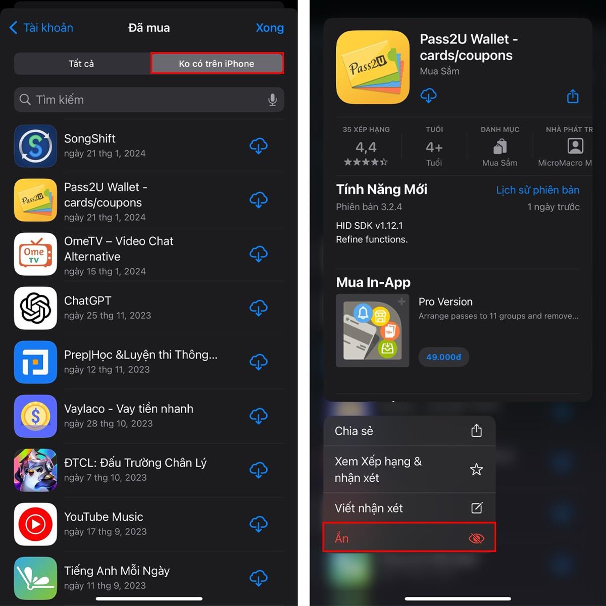 Bước 2: Tại giao diện này, bạn hãy chọn mục Ko có trên iPhone > Người dùng thấy danh sách các ứng dụng đã từng tải trước đó > Hãy Nhấn giữ ứng dụng nào muốn ẩn > Hãy chọn Ẩn là xong hoàn thành.