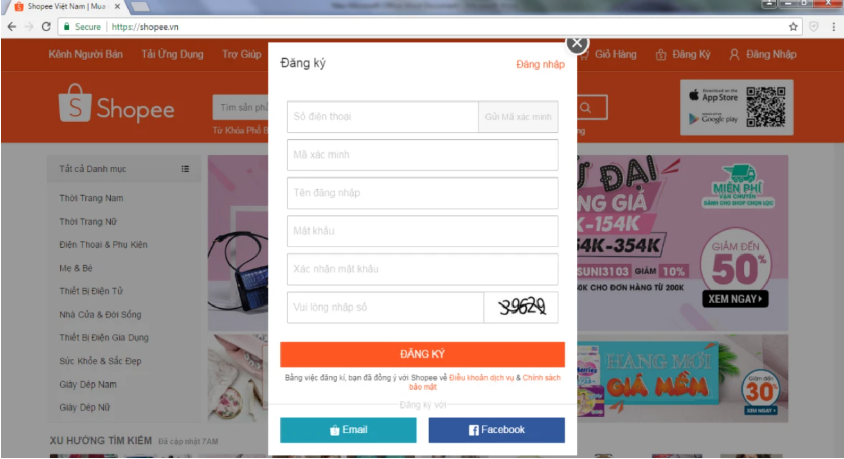Bước 2: Sau đó, bạn bấm vào Đăng ký ở thanh trên đầu trang, rồi điền các thông tin của mình vào để tạo tài khoản bán hàng trên Shopee.