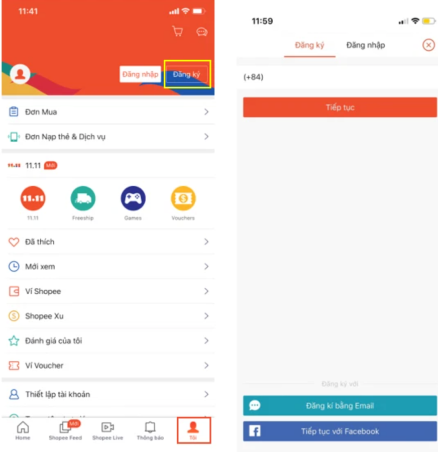 Bước 1: Đầu tiên, bạn chọn đăng ký trên Ứng dụng Shopee.
