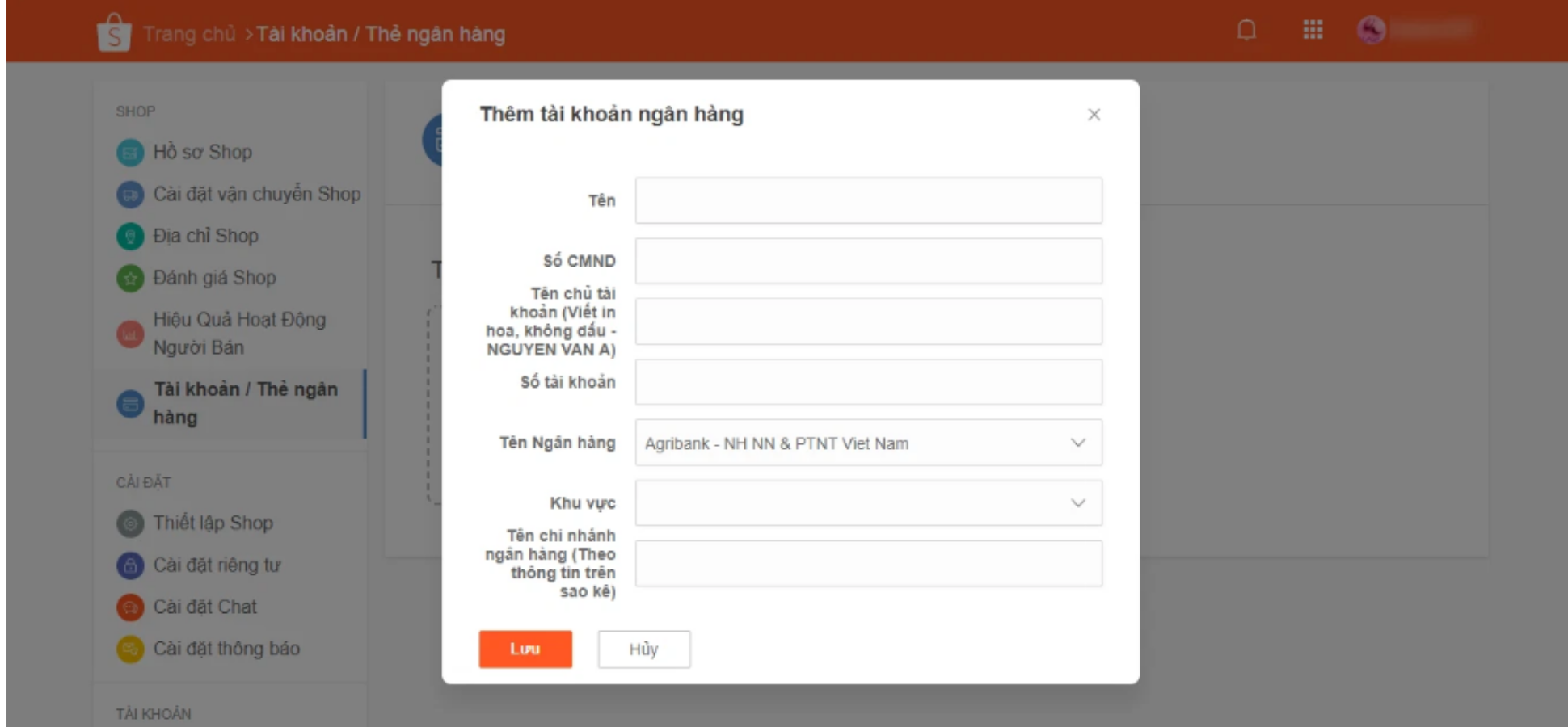 Để nhận tiền bán hàng trên Shopee, bạn cần Thiết lập thanh toán bằng cách nhấn chọn Tài khoản/Thẻ ngân hàng. Sau đó, ấn vào Thêm tài khoản ngân hàng trên Shopee. Khi đó, Popup hiện ra như hình bên dưới. Tới đây, bạn điền đầy đủ thông tin được yêu cầu và nhấn nút Lưu là xong.