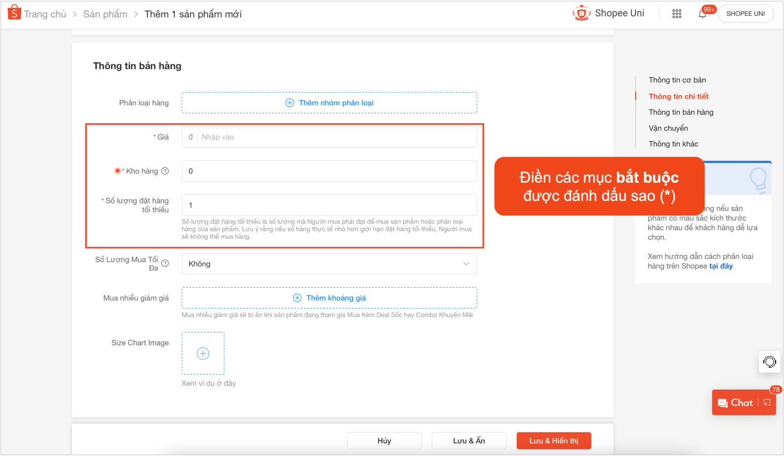 Bên cạnh đó, các thuộc tính bạn điền bắt buộc được đánh dấu sao (*) để có thể đăng tải sản phẩm thành công.