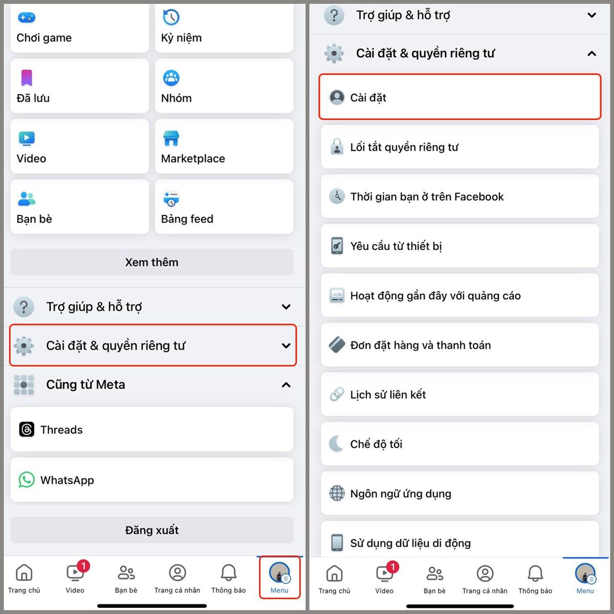 Bước 1: Đầu tiên hãy vào ứng dụng FaceBook > Tiến hành chọn Menu > Chọn Cài đặt & quyền riêng tư > Chọn Cài đặt.