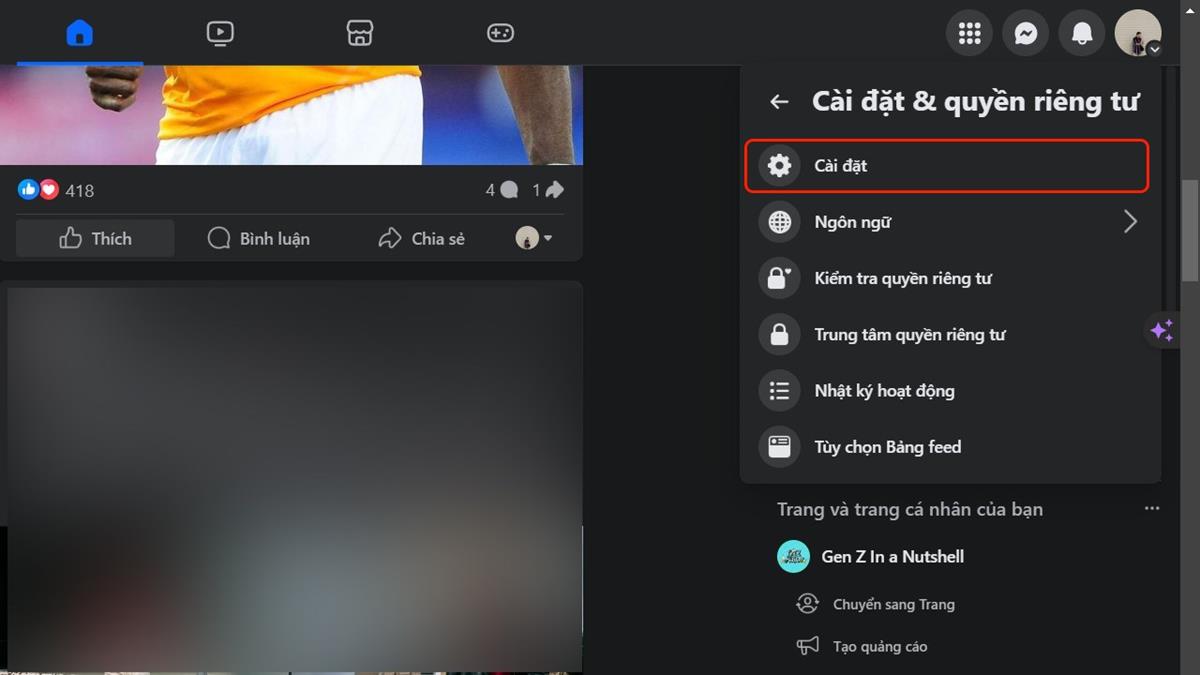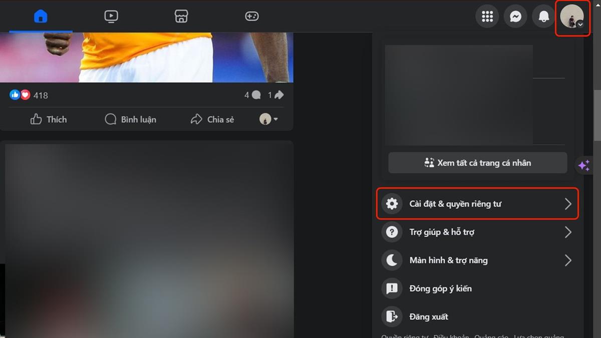 Bước 1: Đầu tiên vào Facebook trên máy tính> Chọn biểu tượng Avatar > Chọn Cài đặt & quyền riêng tư nha.