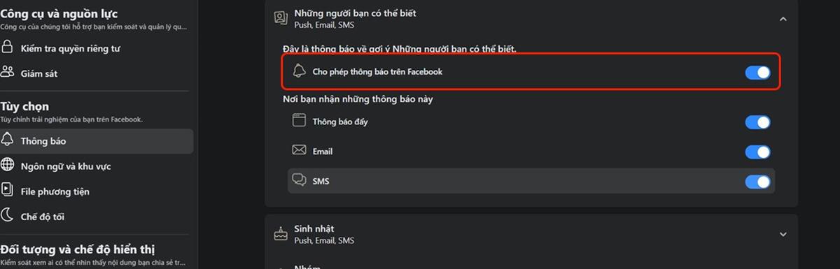 Bước 4: Ở Đây là thông báo gợi ý Những người bạn có thể biết > Tắt Cho phép thông báo trên Facebook. Nếu muốn bật lại chỉ nhấn lại vào đó.
