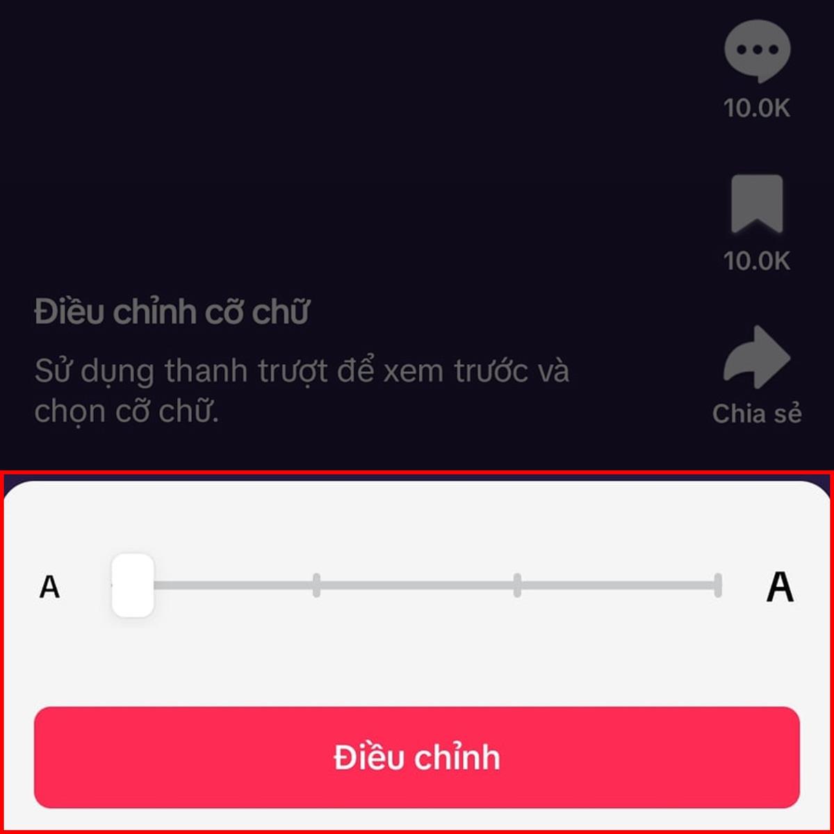 Bước 3: Bạn sẽ thấy có một mục Cỡ chữ hiện lên đầu tiên, hãy ấn chọn vào nó, sau đó điều chỉnh lại cỡ chữ cho nó ở mức bạn cần rồi ấn nút Điều chỉnh màu đỏ ở phía dưới màn hình là hoàn thành nhé.