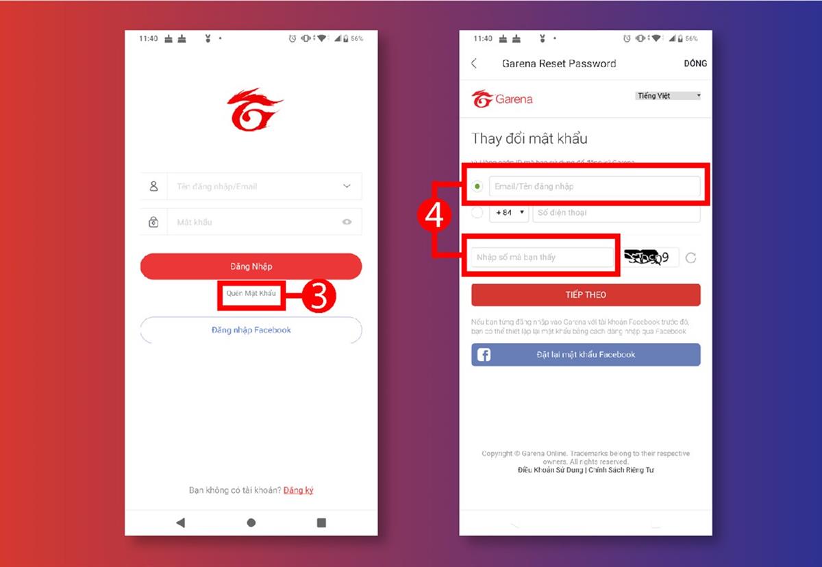 Bước 5: Sau đó bạn nhập Email/ Tên tài khoản và mã Captcha hiển thị trên màn hình để bắt đầu quá trình đổi mật khẩu Garena