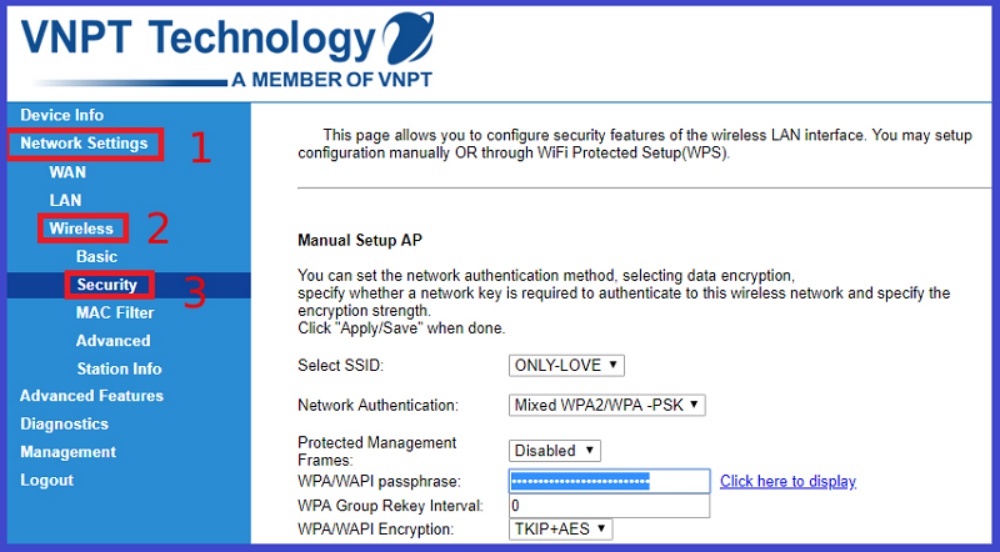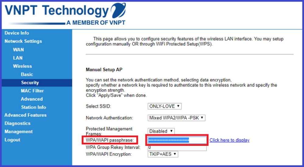 - Bước 5: Cuối cùng, bạn kiểm tra lại mật khẩu Wi-Fi sau khi đổi bằng cách vào Click here to display. Sau đó bấm Apply/Save để lưu là xong.