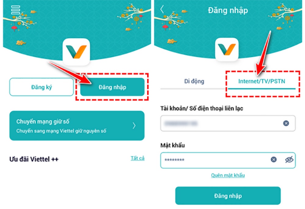 - Bước 1: Đầu tiên, bạn tải/ cập nhật ứng dụng My Viettel phiên bản mới nhất về máy -> Bấm vào Đăng nhập -> Ấn chọn Internet/TV/PSTN