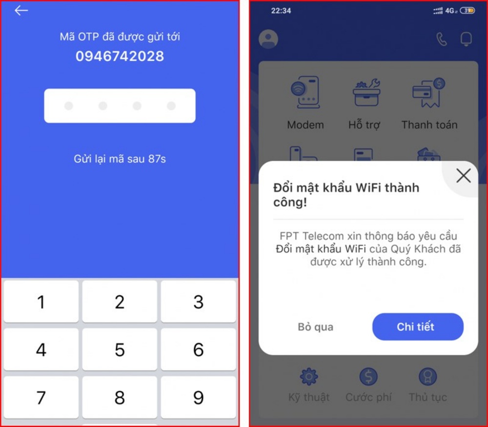 - Bước 5: Cuối cùng, bạn nhập mã OTP để hoàn thành quá trình đổi mật khẩu -> Nếu thành công màn hình sẽ xuất hiện thông báo Đổi mật khẩu wifi thành công