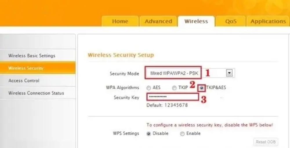 - Sau đó, bạn nhấn tab Wireless -> Wireless Security -> Nhập mật khẩu cho WiFi vào mục Security Key -> Bấm OK là hoàn tất.