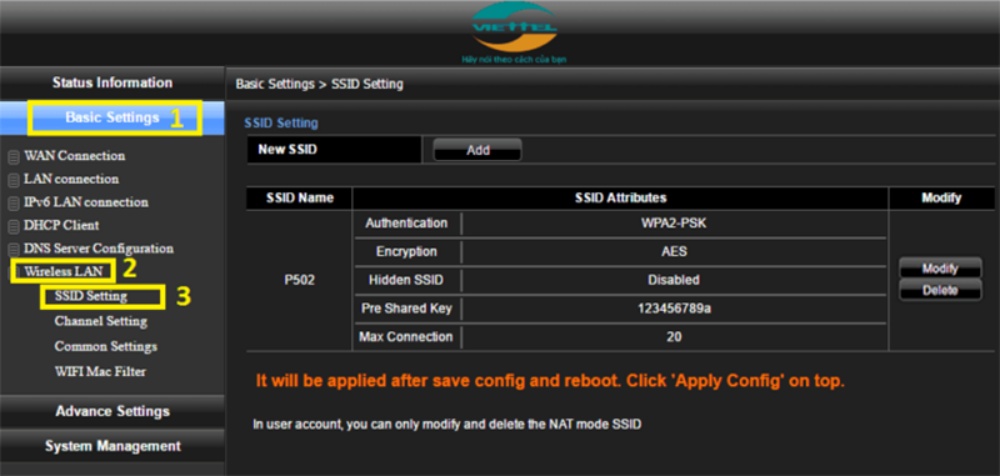 - Bước 3: Click chọn Basic Settings > Wireless Lan > SSID Setting