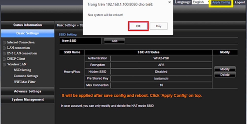 - Bước 4: Tại đây, bạn thay đổi mật khẩu, cấu hình mạng > Rồi chọn Apply Config để lưu lại.
