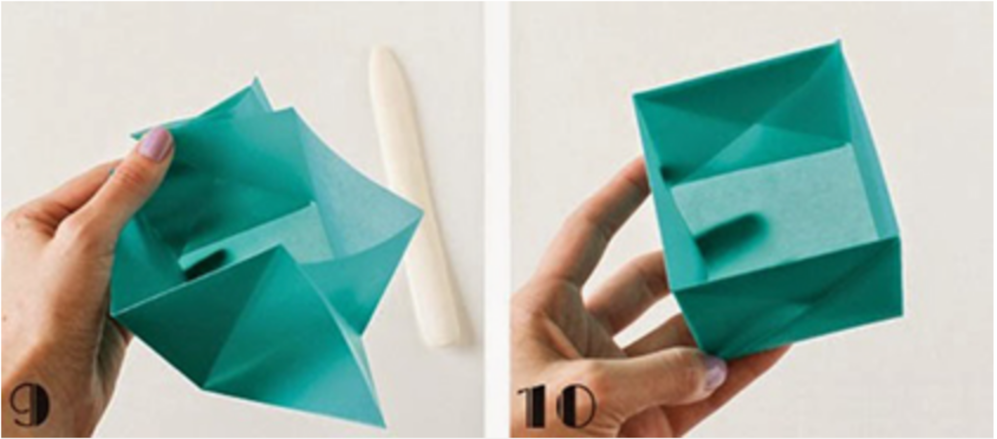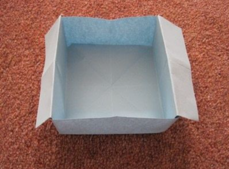 Cuối cùng, bạn chỉ cần xếp hộp dựa theo những đường nét đã tạo bằng cách dùng 2 tay để mở 2 góc đối diện nhau rồi nâng 2 bên đầu góc lên.