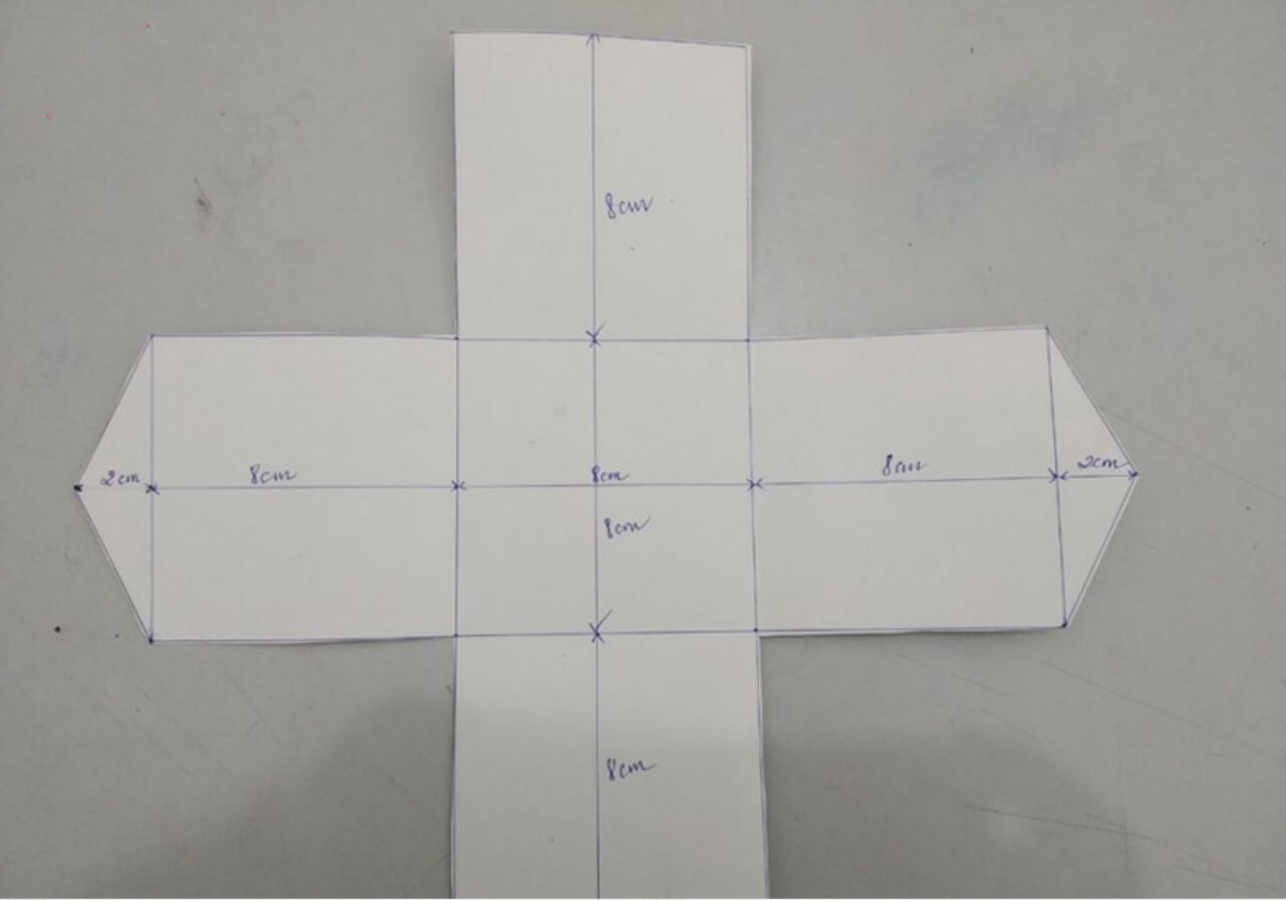 Sau đó, bạn tiếp tục dùng thước để căn theo các đường kẻ rồi gấp chúng lại thành các mảnh của hình đã cắt để tạo thành các đường gân.