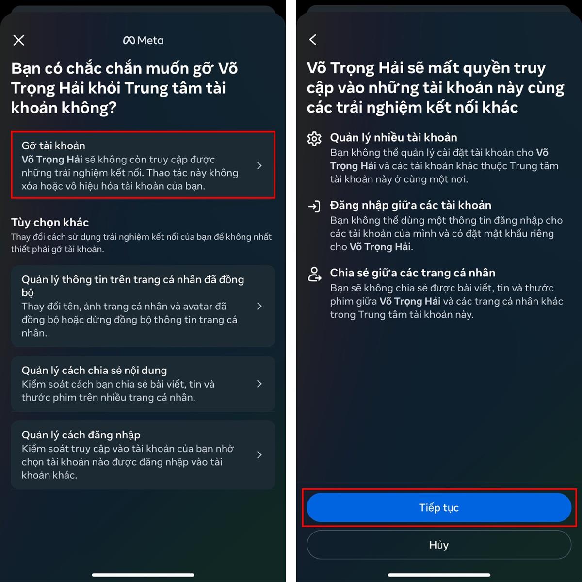 Bước 3: Tại giao diện này, hãy tiếp tục chọn vào Gỡ tài khoản > Nhấn chọn Tiếp tục cho đến khi gỡ xong liên kết là hoàn thành.