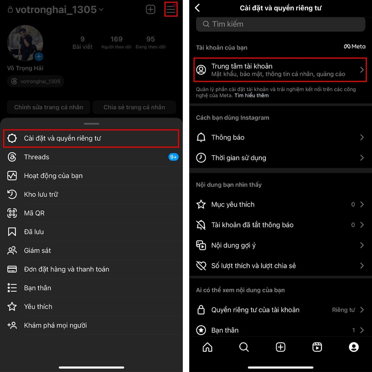 Bước 1: Đầu tiên, truy cập vào ứng dụng Instagram > Sau đó, hãy chọn vào trang cá nhân > Chọn vào biểu tượng 3 gạch nằm ở phía trên góc phải màn hình > Chọn Cài đặt và quyền riêng tư > Chọn Trung tâm tài khoản.