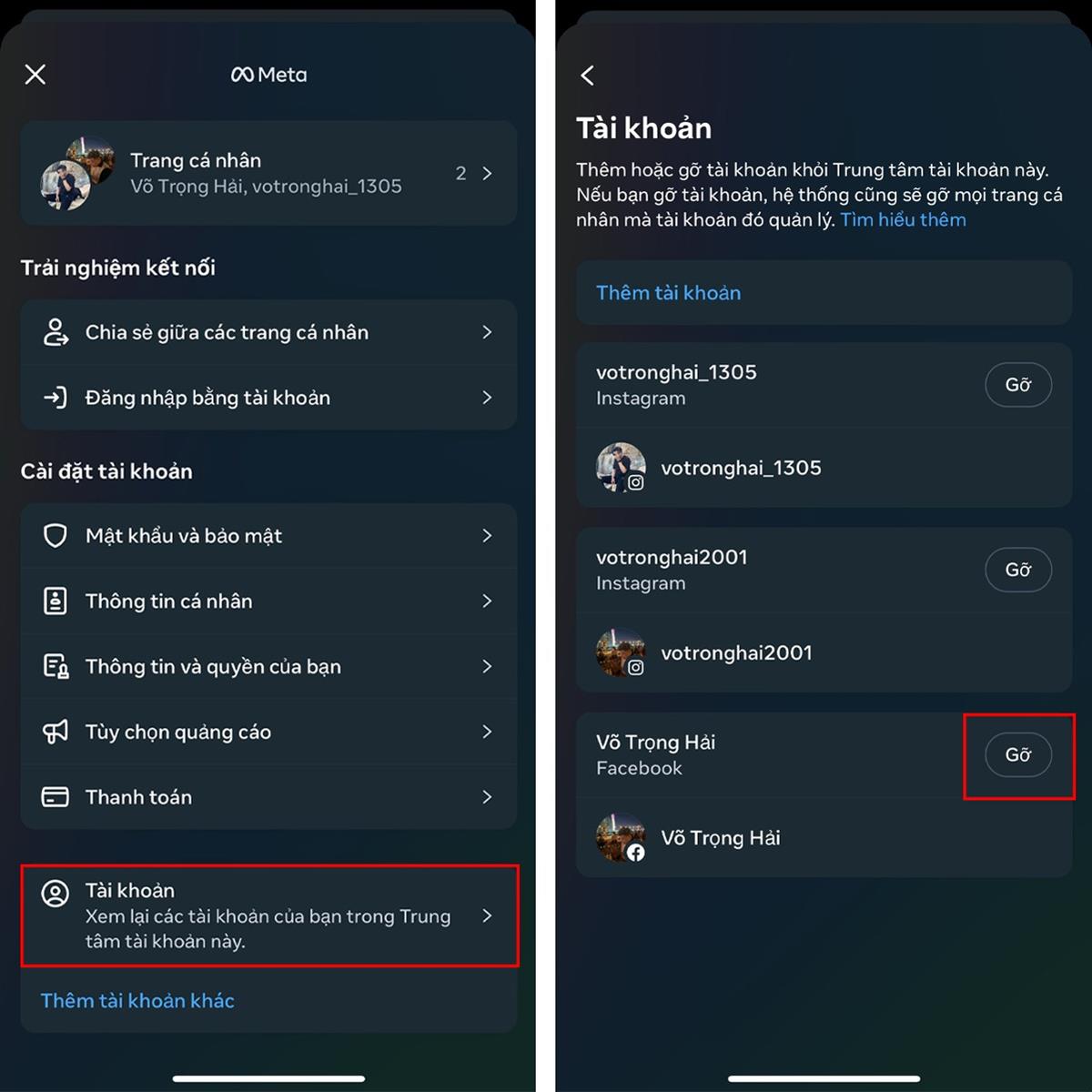 Bước 2: Phía dưới cuối cùng, hãy chọn vào mục Tài khoản > Tại đây, người dùng thấy được tài khoản Facebook mà đã liên kết > Hãy chọn Gỡ.