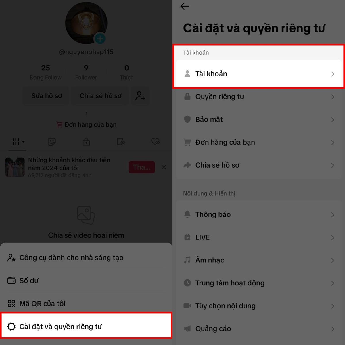 Bước 2: Ngay lập tức sẽ có 1 loạt các tùy chọn hiện lên từ phía bên dưới màn hình, hãy ấn chọn ngay mục Cài đặt và quyền riêng tư. Sau đó, chọn tiếp vào mục Tài khoản ở danh mục các lựa chọn cài đặt.