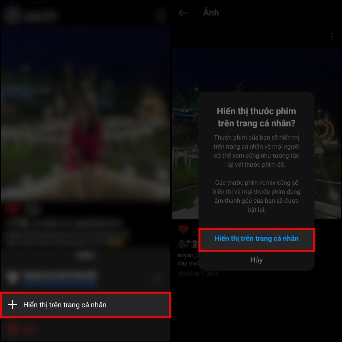 Sau đó, hãy chọn vào biểu tượng dấu ba chấm ở phía trên ảnh > Chọn hiển thị trên trang cá nhân > Cuối cùng, hãy xác nhận hiển thị trên trang cá nhân của mình là xong nhé.