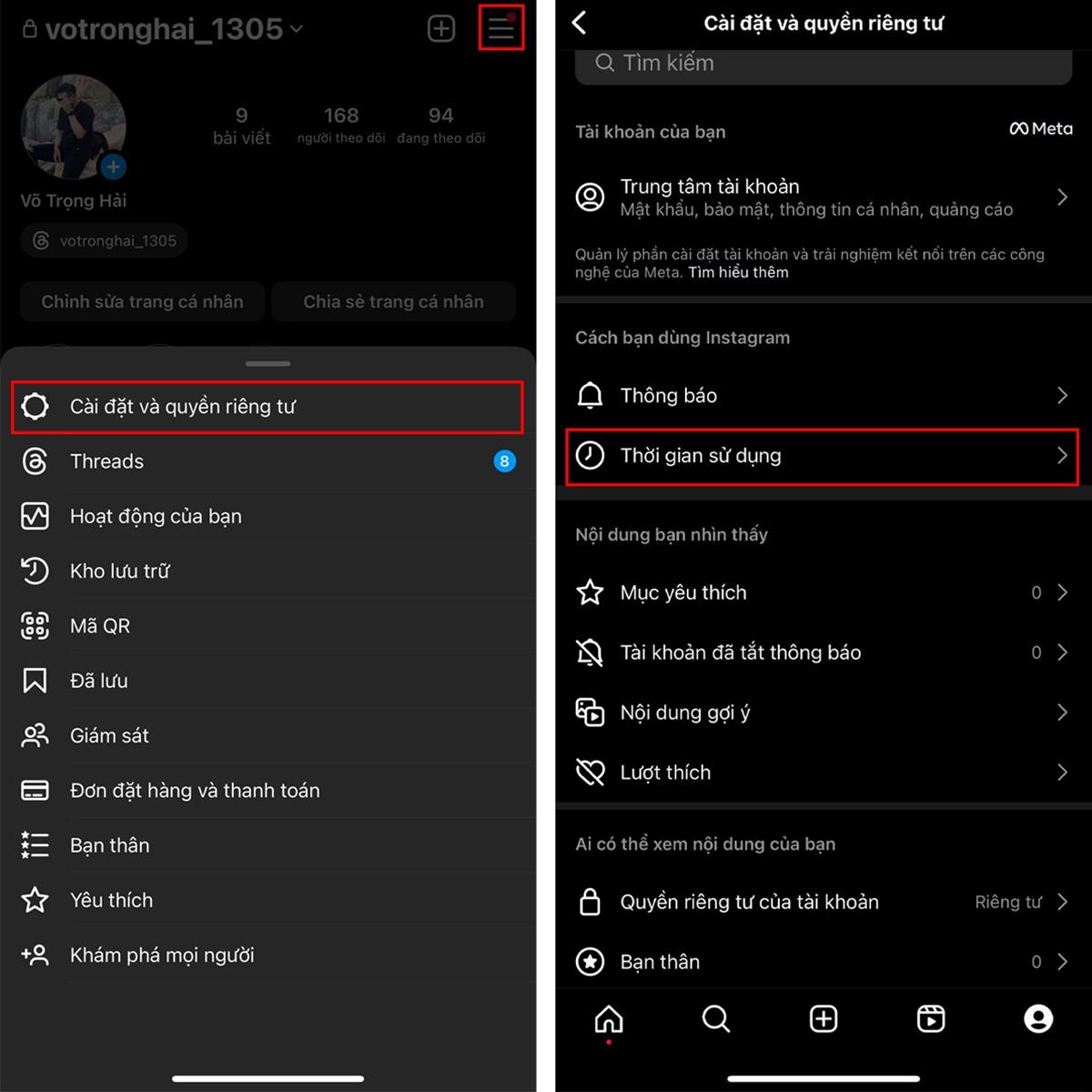 Bước 1: Đầu tiên, vào Instagram > Chọn vào biểu tượng Cá nhân > Phía trên góc phải màn hình chọn biểu tượng 3 gạch > Chọn Cài đặt và quyền riêng tư > Chọn Thời gian sử dụng.