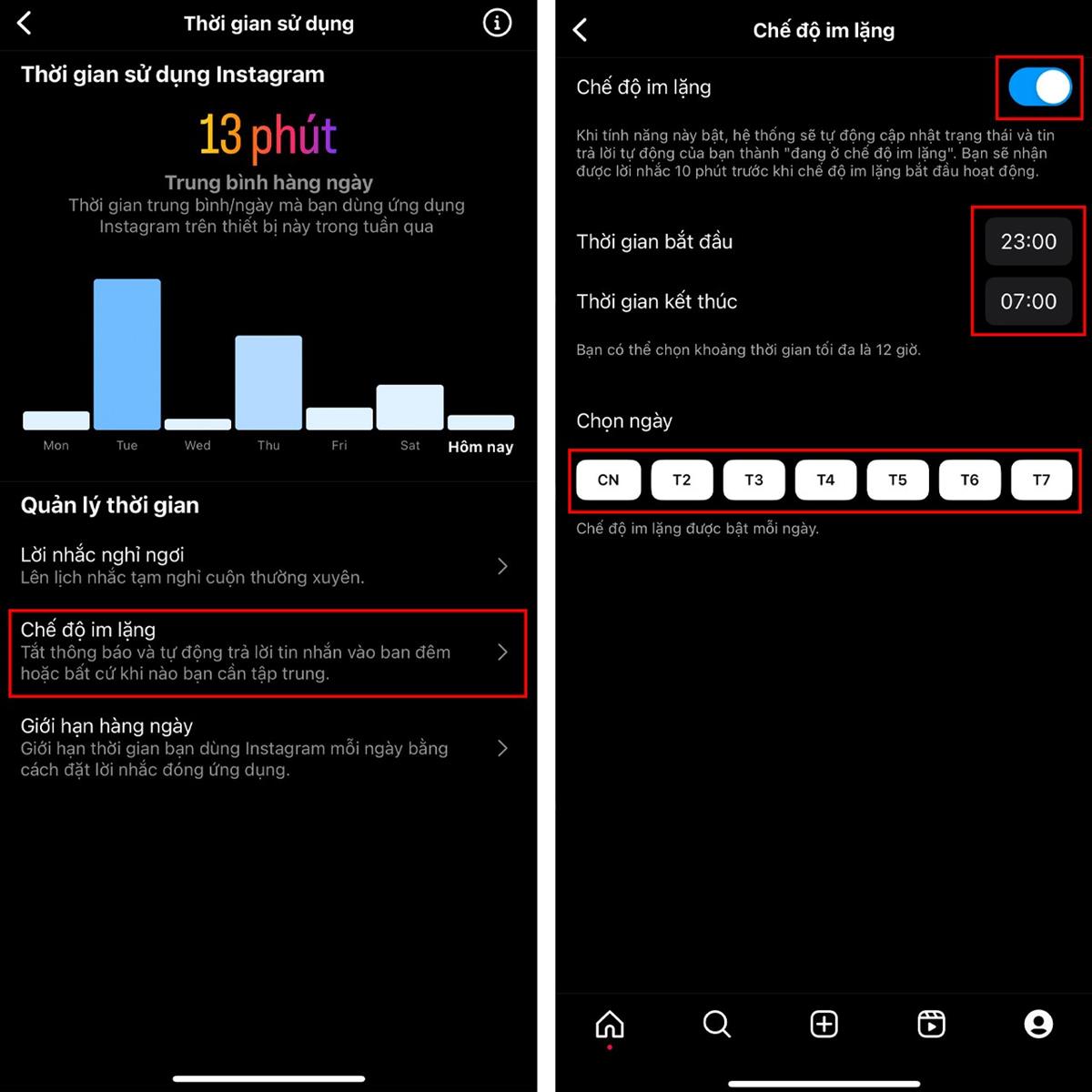 Tận hưởng không gian làm việc tĩnh lặng hơn trên Instagram với chế độ im lặng. Khi kích hoạt, điện thoại sẽ không xuất hiện thông báo từ Instagram, giúp bạn tập trung công việc hơn, ngoài ra bạn còn linh hoạt chọn thời gian kích hoạt chế độ này.