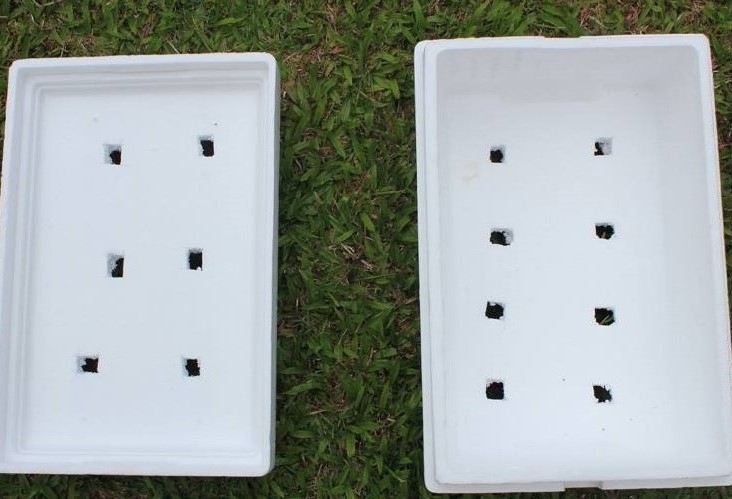 Bước 2: Đục lỗ dưới đáy thùng xốp, lót 3-4 lớp khăn giấy ăn che lỗ lại, sau đó rải lên trên một lớp cát hoặc đất dày khoảng 3 cm nhưng không nên lèn cát quá chặt.