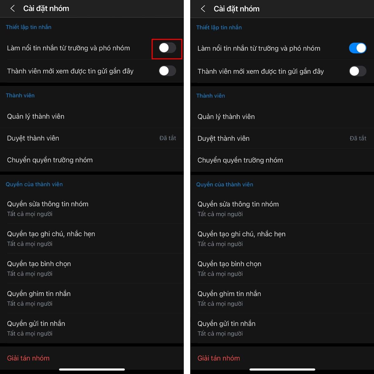 Bước 2: Tiếp theo, hãy bật kích hoạt tính năng Làm nổi tin nhắn từ trưởng và phó nhóm lên là hoàn thành.