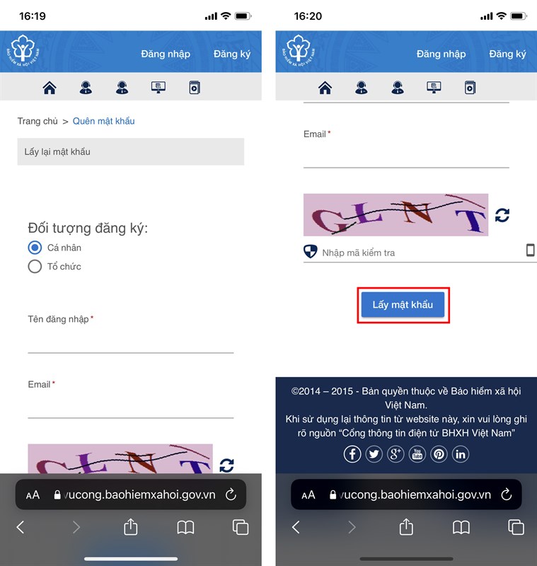 Bước 2: Chọn Đối tượng đăng ký là Cá nhân hay Tổ chức, Tên đăng nhập là Mã số BHXH (10 số cuối BHYT), Email và Nhập mã kiểm tra. Tiếp tục, chọn Lấy mật khẩu.
