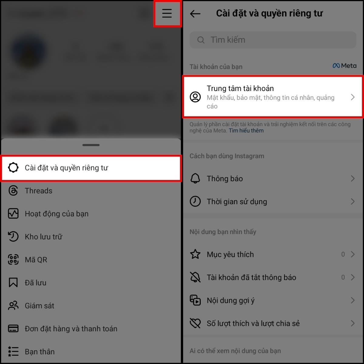 Bước 1: Hãy truy cập vào trang cá nhân trên ứng dụng Instagram > Nhấn chọn biểu tượng ba dưới gạch ngang ở góc bên phải ảnh đại diện > Chọn mục Cài đặt và quyền riêng tư > Chọn vào Trung tâm tài khoản để tiến hành quản lý.