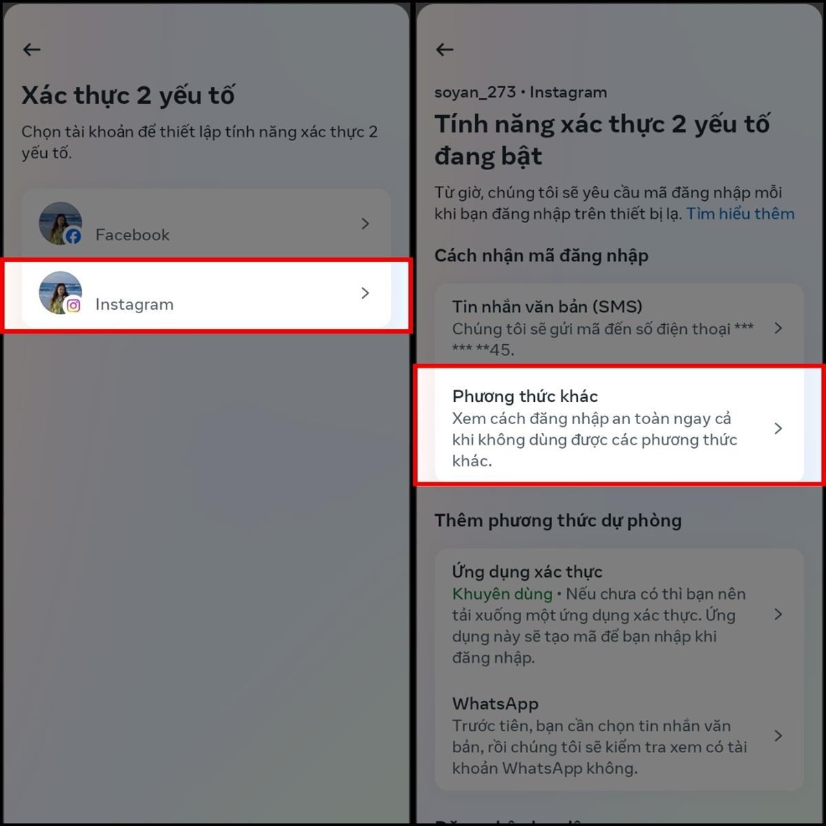 Bước 3: Tại giao diện này, bạn hãy lựa chọn vào tài khoản Instagram để lấy mã dự phòng > Nhấn vào chọn nhận mã bằng Phương thức khác.