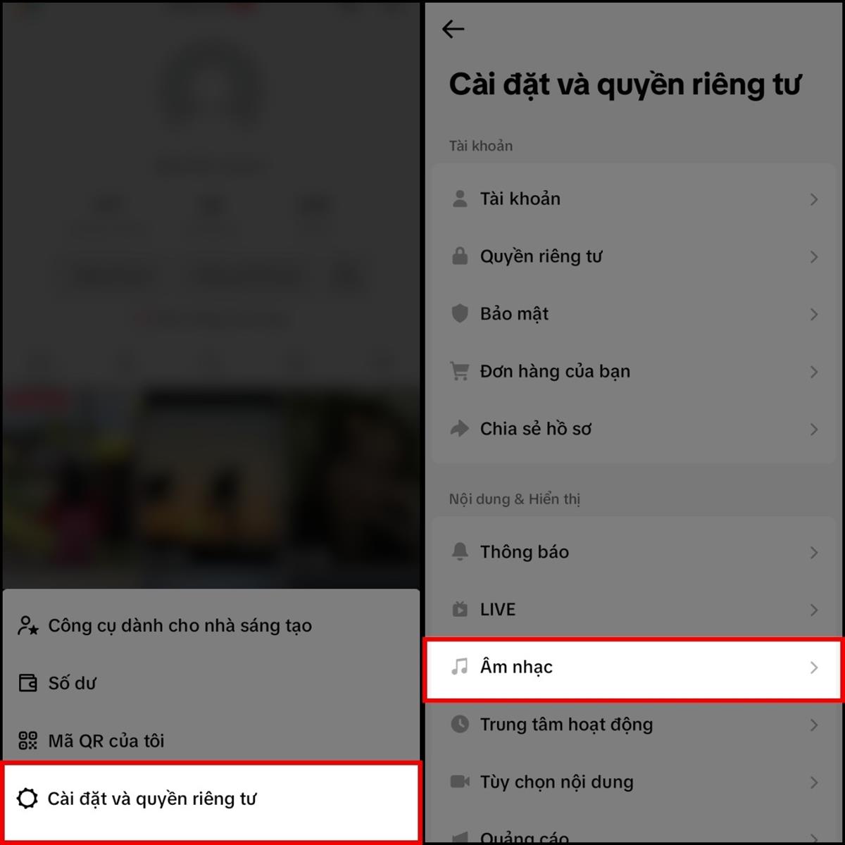 Bước 1: Đầu tiên vào ứng dụng TikTok trên điện thoại > Nhấn vào biểu tượng Hồ sơ cá nhân > Chọn biểu tượng ba dấu gạch ngang ở góc trên màn hình > Chọn vào mục Cài đặt và quyền riêng tư để điều chỉnh > Chọn vào mục Âm nhạc trong phần cài đặt dùm mình.