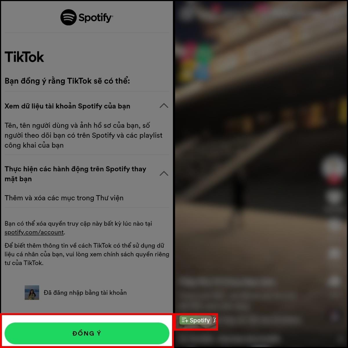 Bước 3: Bây giờ, bạn chỉ cần đọc kỹ các thông tin và xác nhận Đồng ý để liên kết TikTok với Spotify. Sau đó, hãy quay lại lướt TikTok như bình thường > Nhấn chọn vào biểu tượng dấu cộng Spotify ở góc trái dưới màn hình nếu muốn lưu bài hát vào Spotify nhé.