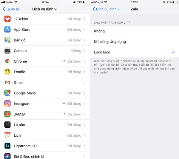 Sau đó, bạn kiểm tra lại danh sách ứng dụng trong điện thoại đang bật định vị. Hãy lựa chọn tắt hoặc không tắt một cách phù hợp, để đảm bảo an toàn thông tin.