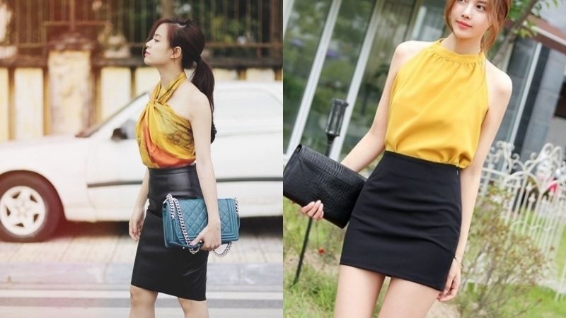 Phối áo cổ yếm với chân váy đen ôm là một công thức giúp các cô nàng khoe được bờ vai thon thả và trắng trẻo. Nếu bạn yêu thích phong cách bánh bèo, đây sẽ là lựa chọn hoàn hảo. Áo cổ yếm mang phong cách sexy và điệu đà, phù hợp với các nàng từ 20 đến 35 tuổi và có thể được sử dụng trong các bữa tiệc hoặc sự kiện quan trọng.