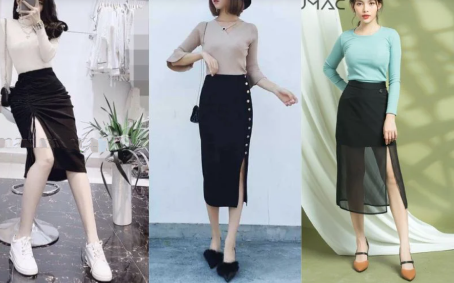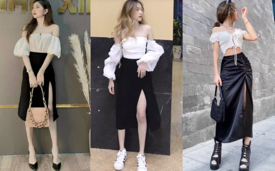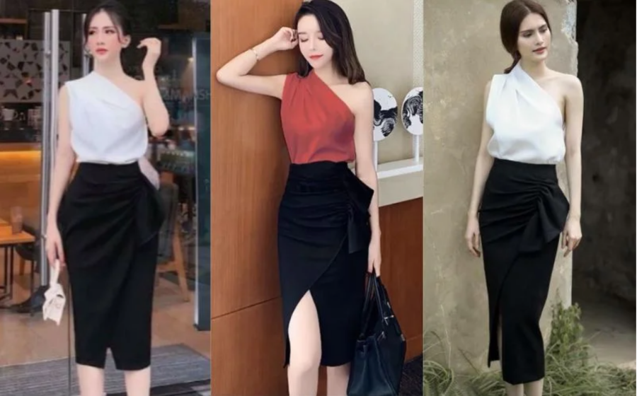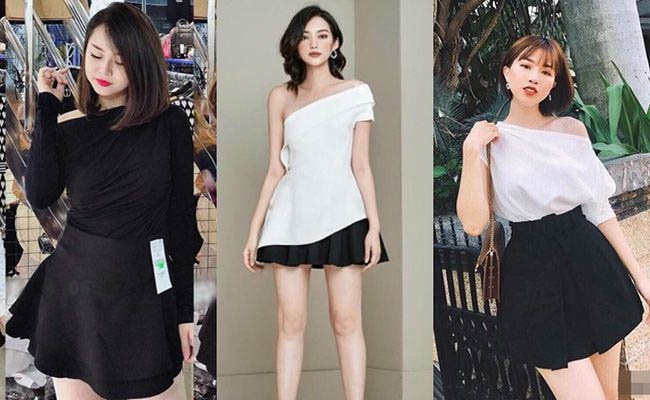 Một lựa chọn phổ biến của cô nàng khi đi làm hay đi chơi với bạn bè là kết hợp chiếc áo lệch vai cùng chân váy đen ngắn hay dài. Sự kết hợp này giúp khoe trọn bờ vai trắng nõn và thân hình thon thả. Nếu bạn yêu thích phong cách gợi cảm và quyến rũ, đây là lựa chọn hoàn hảo để thu hút ánh nhìn của mọi người.